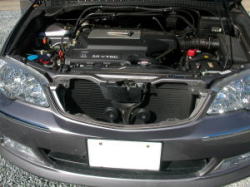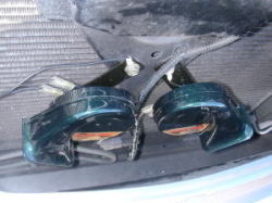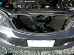 フロントグリルを外します。グリルは、プラスチック製止めピンで4カ所止まっていますので、それを外すと簡単に外せます。ノーマルホーンが2個、見えます。