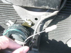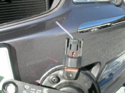 ホーンの接続部を見るとおり、アルファーホーンの端子は一般的な形のものです。車体側からのコードに、写真のような端子を接続しました。ホーンは、写真のように取り付け、取り付け部のねじにアースを取りました。